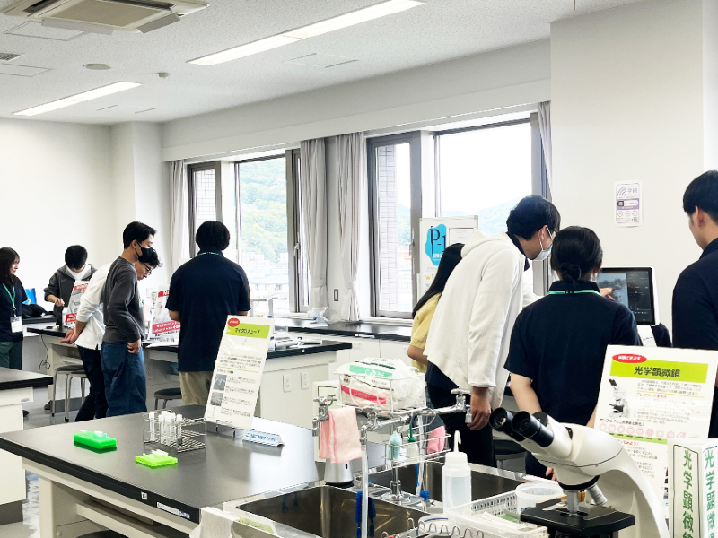 がん細胞の観察やDNAペンダントの作成といったバイオ系の展示から、VRやCGによる情報系の体験まで、多様な内容を通して生命工学科の学びを体感していただきました。