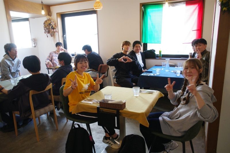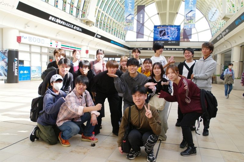 北広島駅のアトリウムに集合したのは、岡本ゼミ生7名と有志の1年生・2年生11名の総勢18名。