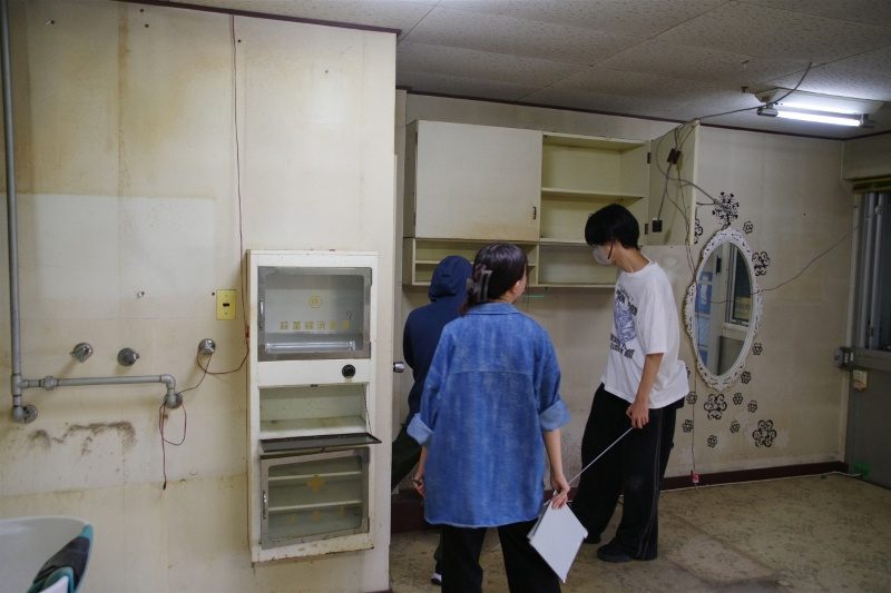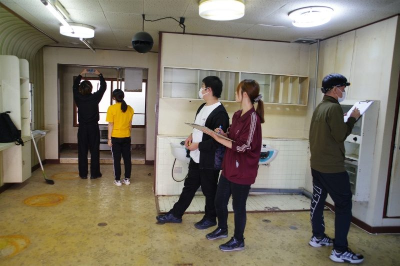 北広島駅から市所有のバスに乗車して対象物件を訪れました。市役所の担当の皆さんとご挨拶したのち、物件の外周と内部とを概観しました。昭和の香り漂うレトロな設えに興味津々です。実測の進め方や道具の使い方についてレクチャーを受けたあと、学年を混ぜた3つのチームに分かれて実測を試しました。昼を迎え、物件オーナーさんと不動産事業者さんのご厚意でランチをご馳走になりました。午後から本格的な実測作業に入り、慣れないながらも少しずつコツを掴んで計測と記録が進んでいきました。計測結果は3次元データに落とし込み、計画検討とプレゼンテーションに活用する予定です。