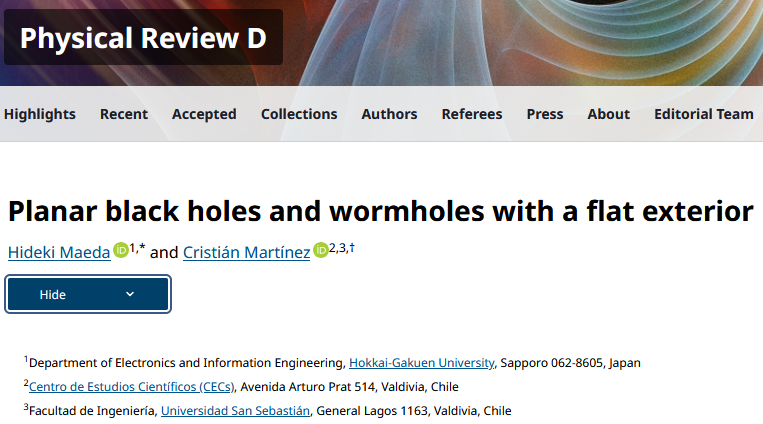 電子情報工学科の前田秀基教授とチリ共和国の科学研究センター(Centro de Estudios Cientificos)とサン・セバスチアン大学(Universidad San Sebastian)に所属のクリスチアン・マルチネス教授との共著論文がPhysical Review D誌に掲載されました。