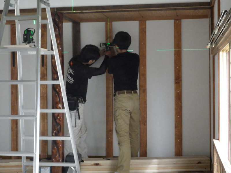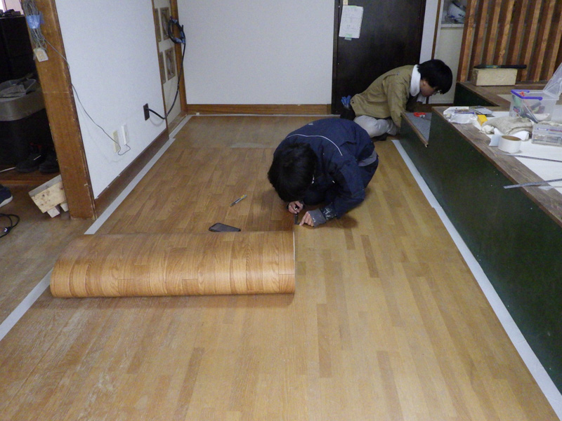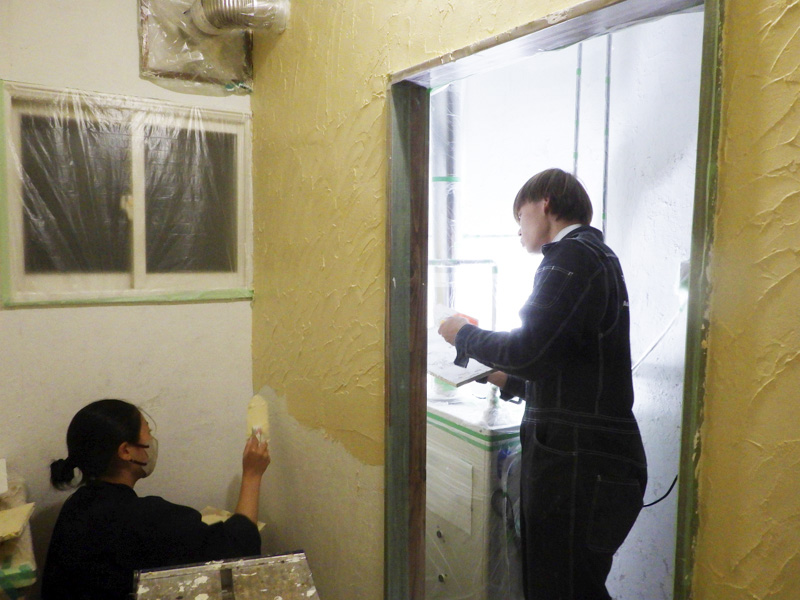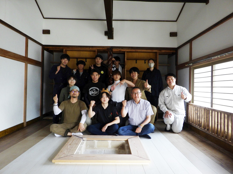 岡本ゼミ所属学生8名に加えて有志の後輩5名の13名で出発、中盤で3名が入れ替わり総勢16名での活動です。3日目には壁紙を貼り終え、4日目にはフローリング材の敷き込みを完了するなど着実に仕上がっていきました。残り時間が減っていくなか道具を探す時間さえ惜しくなっていきます。整理整頓の徹底や次の作業内容を想定した準備が如何に大切かを実感していました。5日目には清掃と併行して可動式本棚の据え付けなど最終工程を収めきることができました。お披露目会には横山町長さん、町民の方々や移住体験中の方々などが訪れてくださり、達成感に溢れ目を輝かせてリノベーションの内容を説明する学生たちの姿がありました。