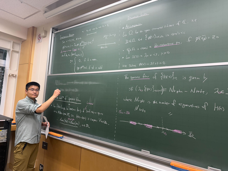 | 講演概要 | 本講演では、N. Azamov によるスペクトル流(spectral flow)の解析的な取り扱いを簡単に紹介します。ここでは「resonance point」や「resonance index」といった解析的概念を用いて、より局所的かつ計算しやすいスペクトル流の枠組みを説明します。まず一次元の解析関数の零点の挙動から出発し、intersection number や root の分岐の仕組みを見た後、有限次元のエルミート行列における固有値の解析的列挙へと話を拡張します。続いて、無限次元の場合に現れる resolvent の極・Laurent 展開・generalised eigenspace などの構造を概観し、resonance index が局所的な spectral flow と一致することを紹介します。最後に、unitary 作用素の場合にも同様の議論が可能であることに触れ、全体として spectral flow を解析的に理解するための道具立てを示します。 |