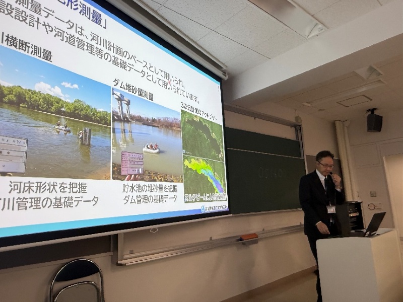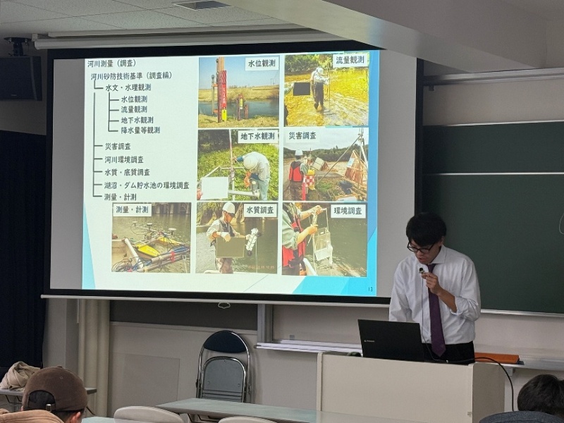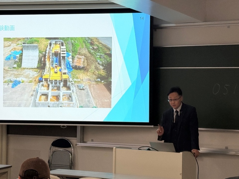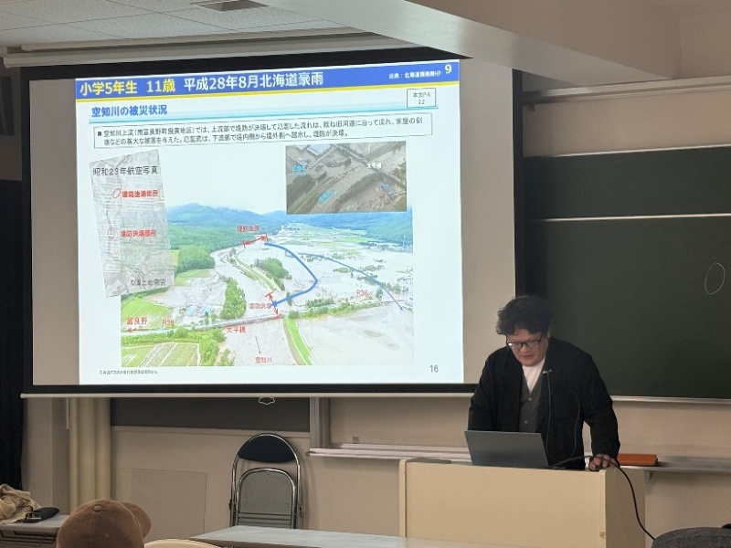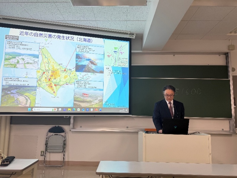 11月26日に2年次開講の防災工学で建設コンサルタントの視点からみた防災をテーマに複数の会社から講演をして頂きました。本講演では「企画」、「調査・計画」、「設計・解析」「維持管理」という各ステップから各社が得意とする立場で河川の防災・減災にためにどのような仕事が実際に行われているのか説明をして頂きました。北海道特有の結氷河川の課題であるアイスジャムや河川計画の際の氾濫シミュレーション、AIを使った堤防管理、令和7年9月に北海道で初めて発生した線状降水帯による水害発生後の1次対応の実際、メーカーから見た防災と内容に富んだ講演となりました。普段の生活で意識されることは少ないですが、川には常に人の手が入っており、それによって防災・減災が実現していることを認識する貴重な機会となりました。本講演会では各分野の第1線で活躍されている本学科卒業生の皆様にお世話になりました。この場を借りて御礼申し上げます。