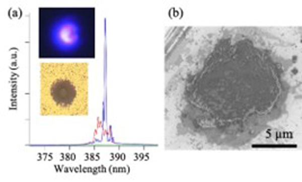 そこで本研究では、p型GaN基板上にn型の市販のZnO粒子膜を作製した後、この粒子膜にレーザーを集光照射することで一部の粒子を焼結する方法を提案しました。レーザー焼結後、この粒子膜を洗浄すると、レーザーを照射した箇所のZnO粒子が残り、マイクロサイズのZnO粒子焼結体を作製できます。図1は、ガラス基板上にZnO粒子を焼結した結果を示しており、レーザーを照射した箇所にZnO粒子が残留することを確認しただけでなく、光学励起によってこの焼結体でランダムレーザー発振が誘起されることを確認しました。さらに、同様の実験をp型GaN基板上で行った後、この粒子焼結体に透明電極(FTO)基板を圧着し、電気を流してみると、図2に示すように、焼結体からZnOに由来した紫外発光が確認できました。また、電流電圧測定結果が非線形な挙動を示すことから、ZnO焼結体とGaN界面のpn接合に由来した紫外発光であることも確認しました。
