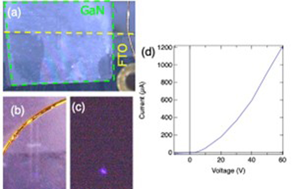 図2 ZnOナノ粒子を焼結したp型GaN基板に透明電極(FTO)基板を圧着した電気駆動用素子の(a)接着部の写真と(b)レーザー焼結体付近の拡大図、(c)同じ場所の電気駆動発光の写真.(d)電流電圧特性.
